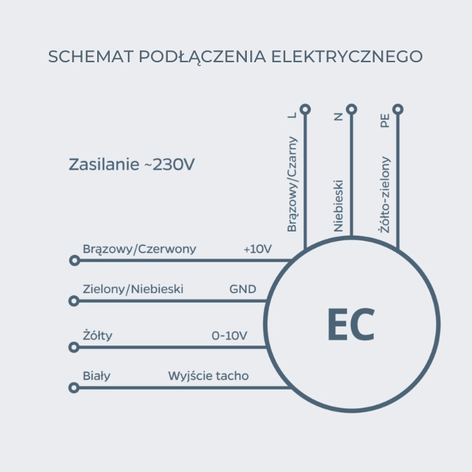Silnik EC z płynną regulacją – wyposażony w zewnętrzną puszkę przyłączeniową; pozwala na bezstopniowe sterowanie sygnałem 0-10V, co umożliwia idealne dopasowanie obrotów do aktualnych potrzeb.