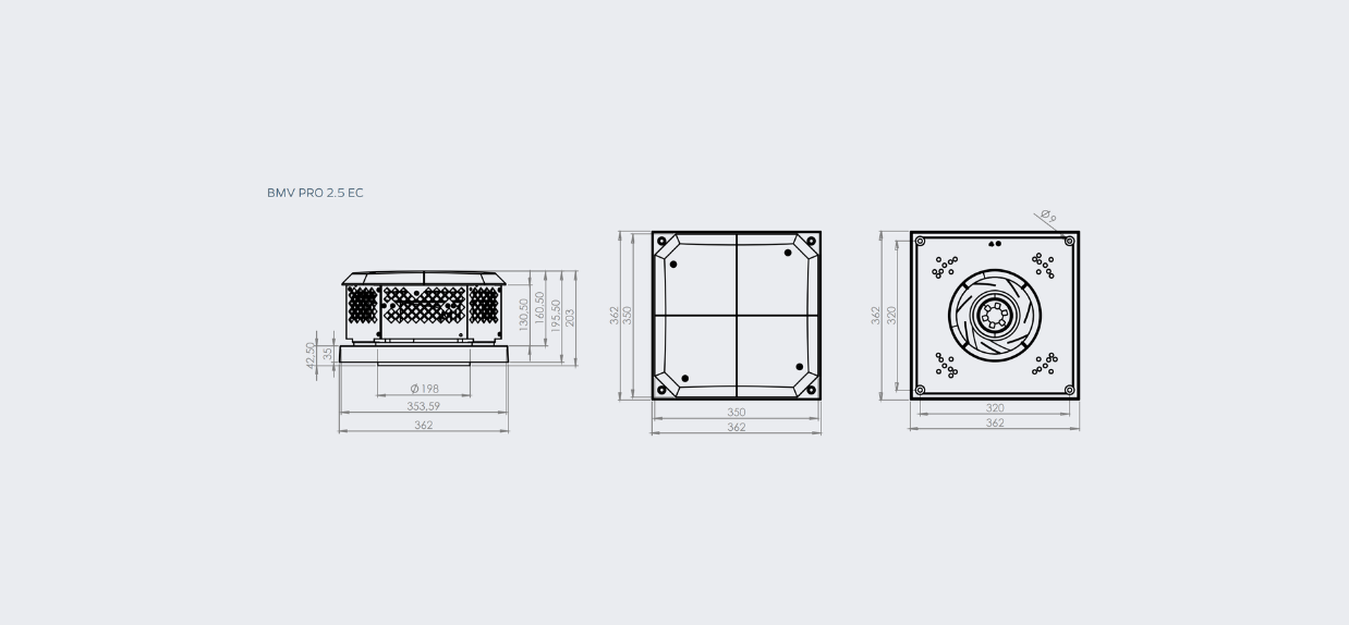 Wentylator dachowy BMV PRO EC z poziomym wyrzutem powietrza. Jest przeznaczony do montażu zewnętrznego, na dachu, na końcach kanałów wentylacyjnych w budynkach mieszkalnych, komercyjnych i przemysłowych o niewielkim stopniu zanieczyszczenia powietrza cząstkami stałymi. Wentylator może współpracować z kontrolerem CSR-B, który zapewni stabilną pracę wentylacji w każdych warunkach i dokładnie według wytycznych projektowych.