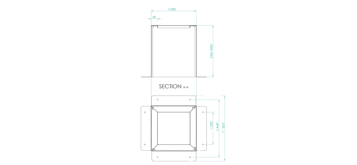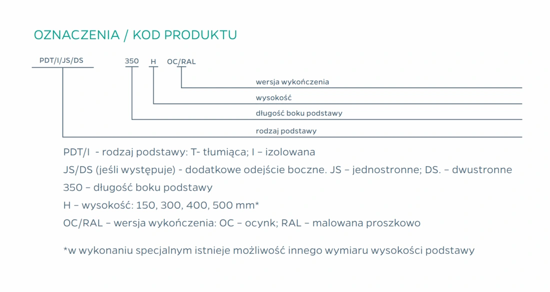 - Dostępne są dwa rodzaje podstaw: PDI – izolowana, wewnątrz której znajduje się izolacja o grubości 10 mm (pianka poliuretanowa) zapobiegająca powstawaniu skroplin, PDT– tłumiąca, posiadająca izolację o grubości 30 mm (wełna mineralna). Podstawa może być wyposażona w dodatkowe odejścia boczne (pojedyncze lub podwójne).