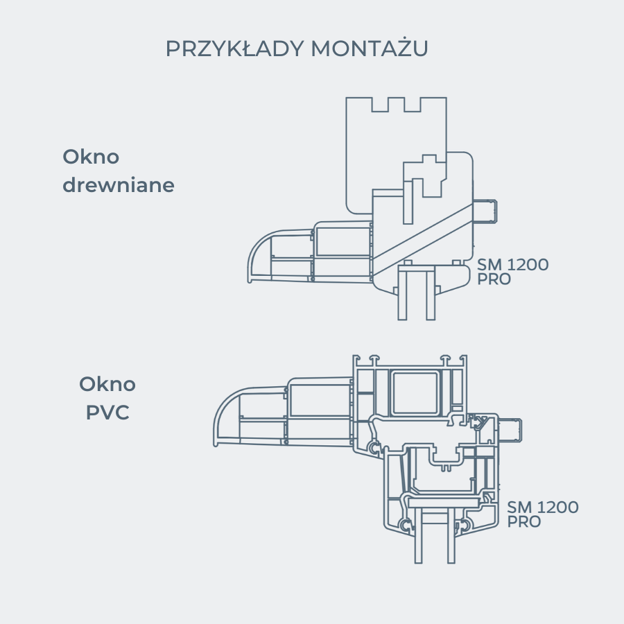 - Montaż nawiewnika SM 1200 PRO: montowane są do stolarki za pomocą wkrętów. Od strony zewnętrznej montowana jest czerpnia akustyczna oraz łącznik akustyczny.