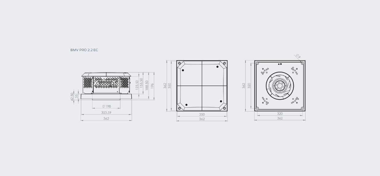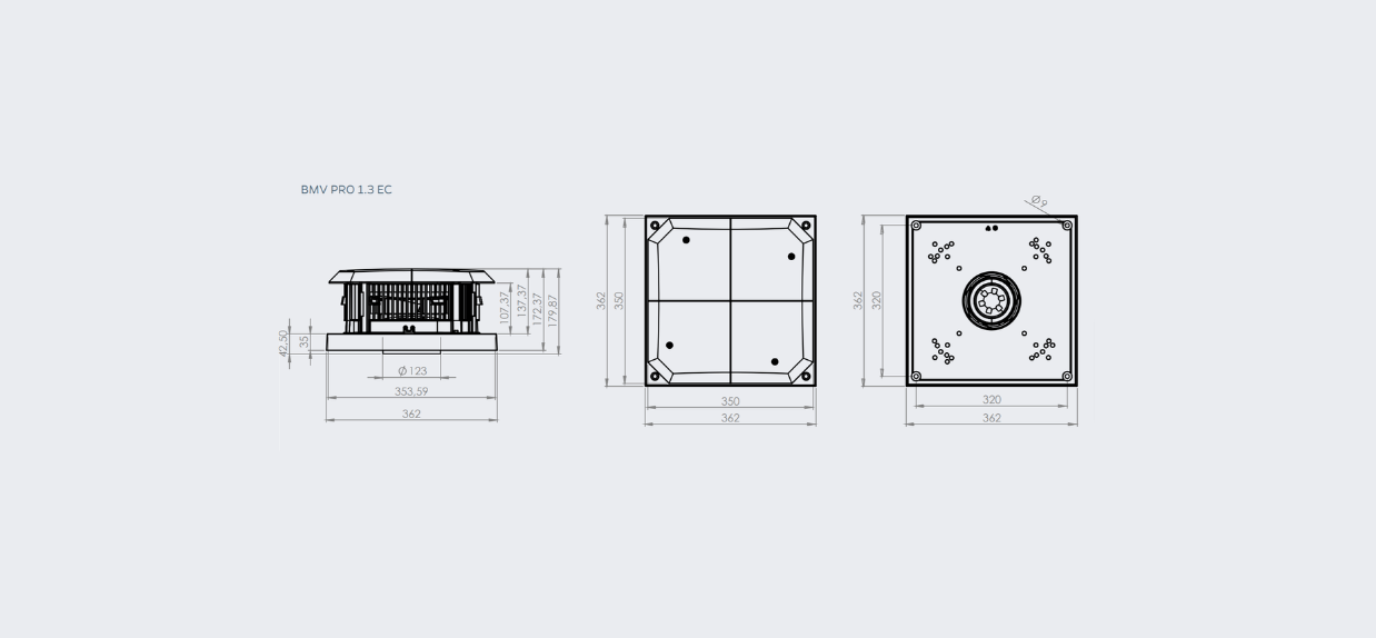 Wentylator dachowy BMV PRO EC z poziomym wyrzutem powietrza. Jest przeznaczony do montażu zewnętrznego, na dachu, na końcach kanałów wentylacyjnych w budynkach mieszkalnych, komercyjnych i przemysłowych o niewielkim stopniu zanieczyszczenia powietrza cząstkami stałymi. Wentylator może współpracować z kontrolerem CSR-B, który zapewni stabilną pracę wentylacji w każdych warunkach i dokładnie według wytycznych projektowych.